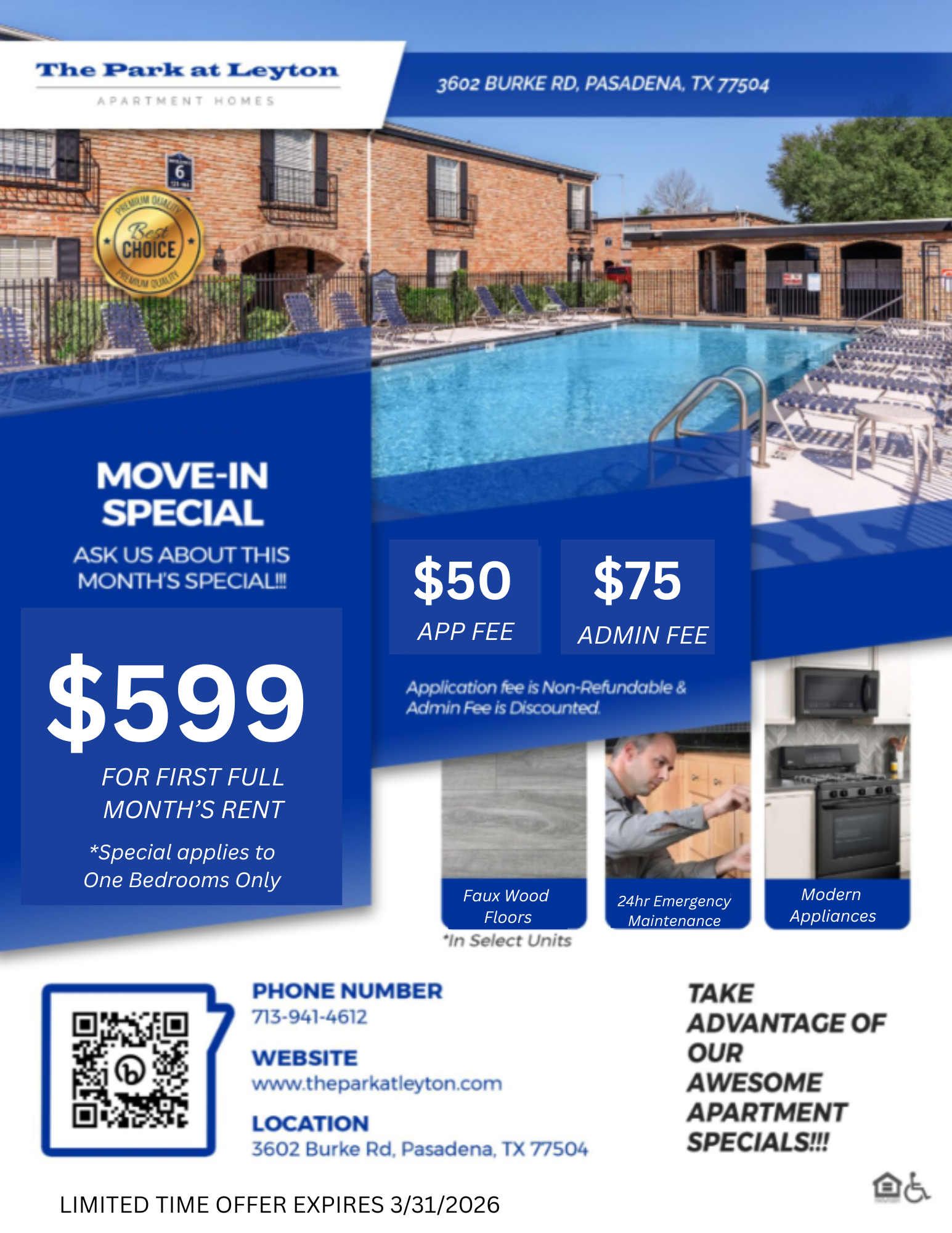 Spring is in the air!🌸Move into your new home this March and take advantage of our limited-time move-in specials. First Full Month’s Rent is just $599 New season, new space, new savings — don’t miss your chance to make your move!